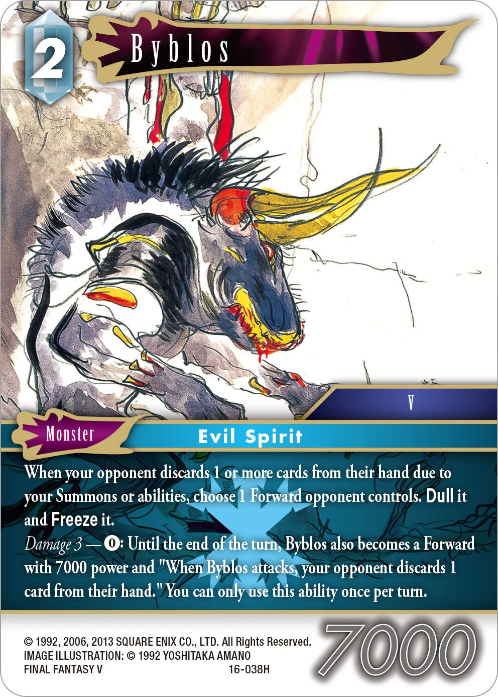 Damage 3 — 0: Until the end of the turn, Byblos also becomes a Forward with 7000 power and "When Byblos attacks, your opponent discards 1 card from their hand." You can only use this ability once per turn.